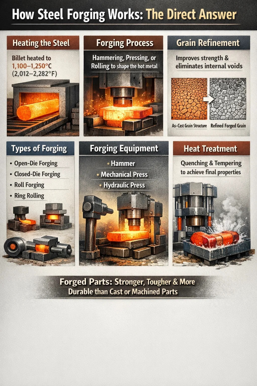 Støbt stål indeholder en grov, dendritisk kornstruktur med kemisk adskillelse mellem korngrænser og indre krympehuller eller porøsitet. Når dette materiale er smedet, sker der flere ting samtidigt: