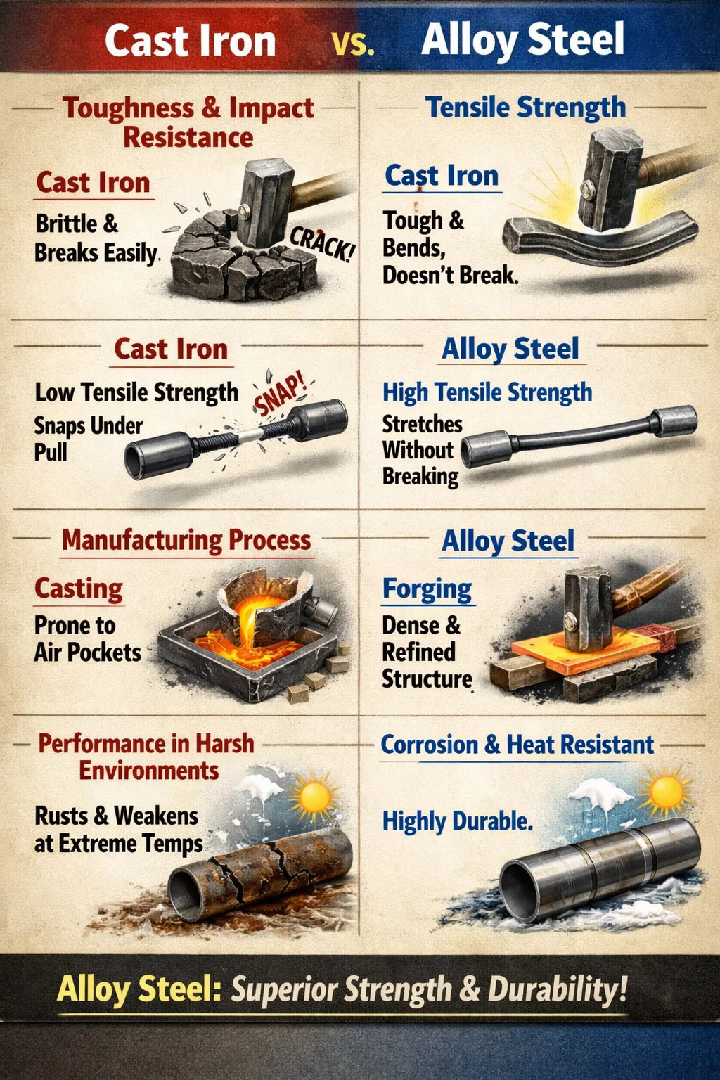 Legeret stål er generelt stærkere og mere holdbart end støbejern, især når det udsættes for slag, spændinger og kraftigt tryk. Mens støbejern har sine styrker i visse specifikke applikationer (såsom fremstilling af gryder eller værktøjsmaskiner), er legeret stål det overlegne materiale med hensyn til den samlede ydeevne.