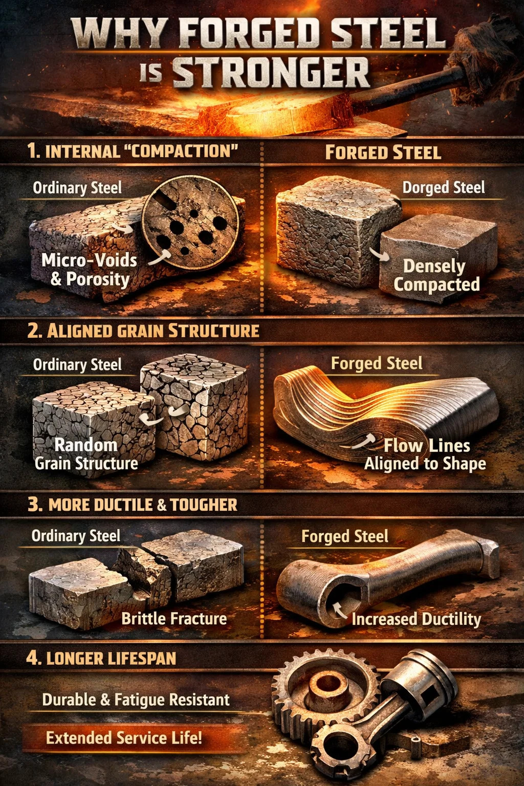 Smedet stål: Under enormt tryk bliver disse små porer fuldstændigt fladtrykte og svejset sammen, hvilket gør hele metalstykket så tæt som en solid blok. Uden indre defekter er delen naturligt stærkere.