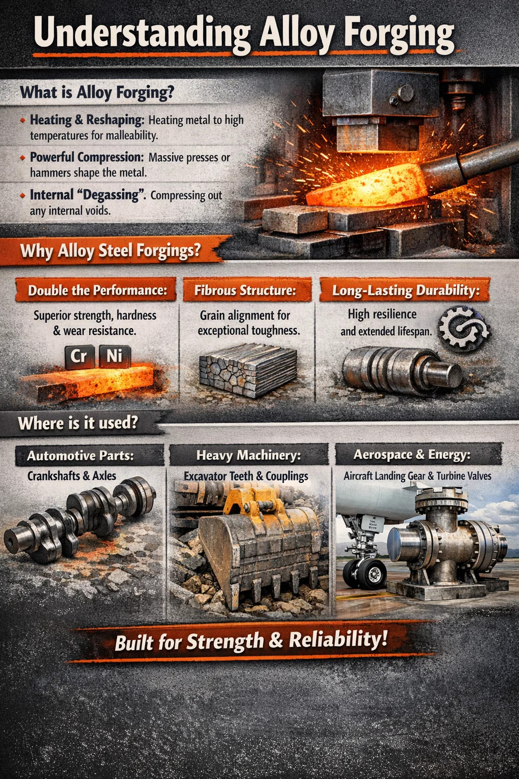 Tungt maskineri: "Tænderne" og samlingerne på gravemaskiner og bulldozere, der kommer direkte i kontakt med sten, bruger ofte legerede stålmaterialer. Luftfart og energi: I kritiske og barske miljøer såsom flylandingsstel og store ventiler i kraftværker bruges legeringssmedninger næsten udelukkende.