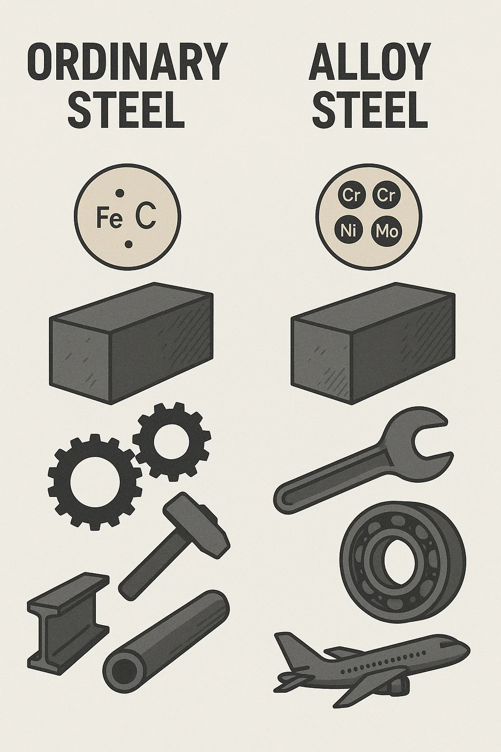 | Primær sammensætning | Jernkulstof (med minimale sporurenheder) | Jern Carbon Signifikant tilsatte legeringselementer (f.eks. krom, nikkel, molybdæn) |